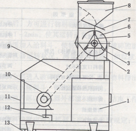 8-進(jìn)料斗;9-三角帶;10-電動(dòng)機;11-底座;12-調節螺桿;13-底座;