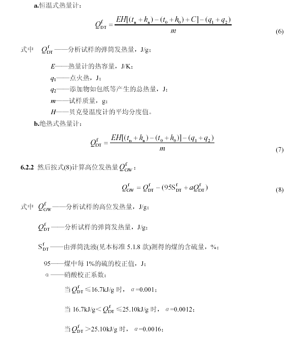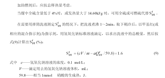注:這里規定的對硫的校正方法中,略去了對煤樣中硫酸鹽的考慮。這對絕大多數煤來(lái)說(shuō)影響不大,因為煤的硫酸鹽硫含量一般很低。但有些特殊煤樣,含量可達0.5%以上。根據實(shí)際經(jīng)驗,煤樣燃燒后,由于灰的飛濺,一部分硫酸鹽硫也隨之落入彈筒,因此無(wú)法利用彈筒洗液來(lái)分別測定硫酸鹽硫和其他硫。遇此情況,為求高位發(fā)熱量的準確,只有另行測定煤樣中的硫酸鹽硫或可燃硫,然后做相應的校正。關(guān)于發(fā)熱量大于14.60kJ/g 的規定,在用包紙或摻苯甲酸的情況下,應按包紙或添加物放出的總熱量來(lái)掌握。