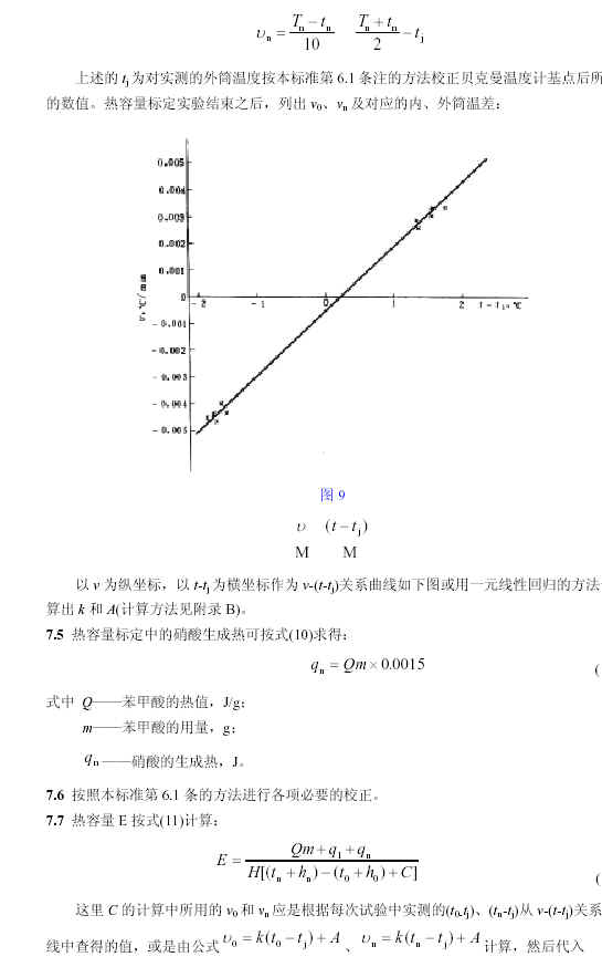 7.1 計算發(fā)熱量所需的熱容量E 和恒溫式熱量計法中計算冷卻校正值所需的v-(t-tj)關(guān)系曲線(xiàn)或儀器常數k 和A 通過(guò)同一試驗進(jìn)行標定。