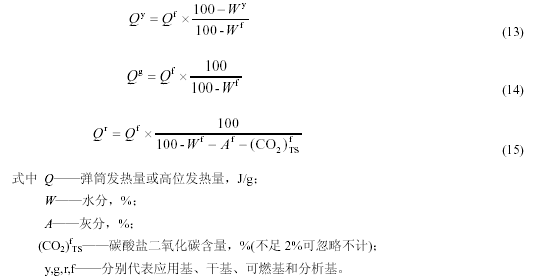 各種不同基礎的煤的發(fā)熱量按式(13)、式(14)、式(15)互相換算: